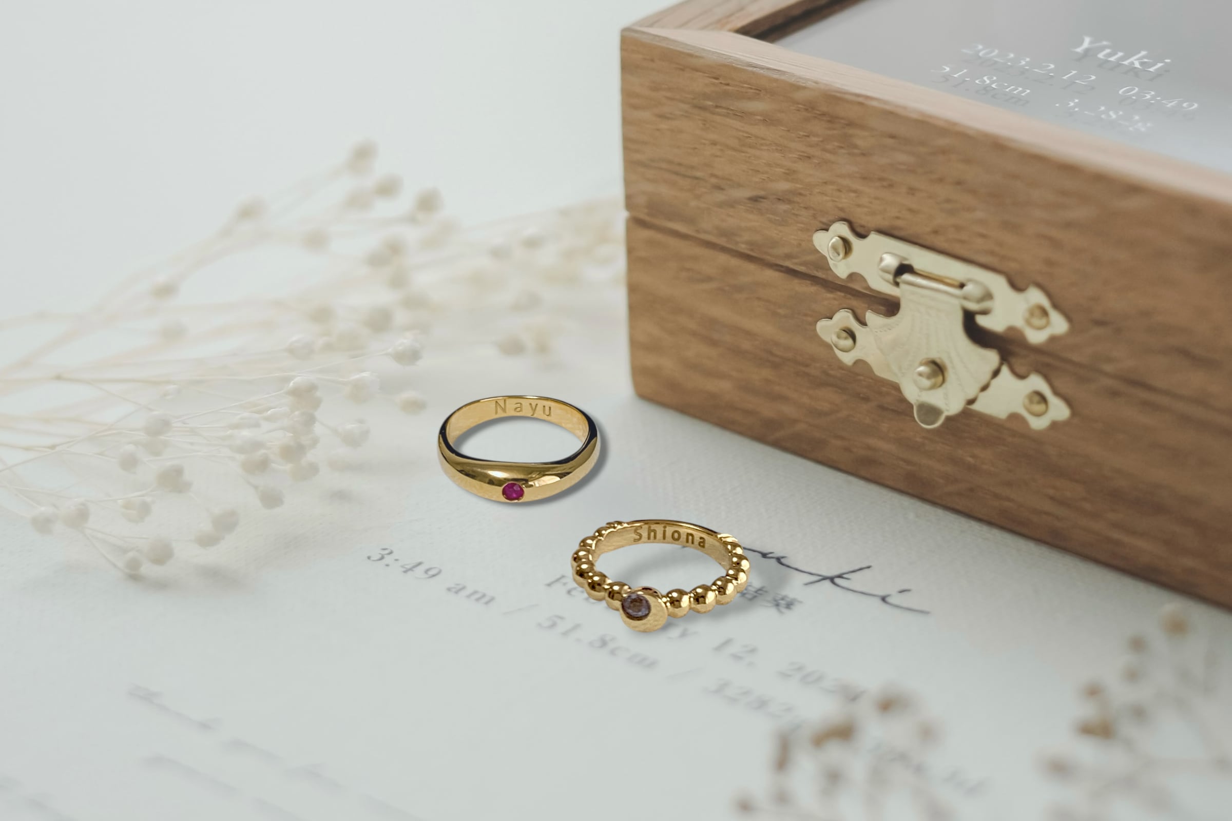 誕生の証や想いを込めたベビーリング、マリッジリング、ファミリーリングに、たいせつな人のお名前を刻印した、世界でひとつのジュエリーをお届けいたします。